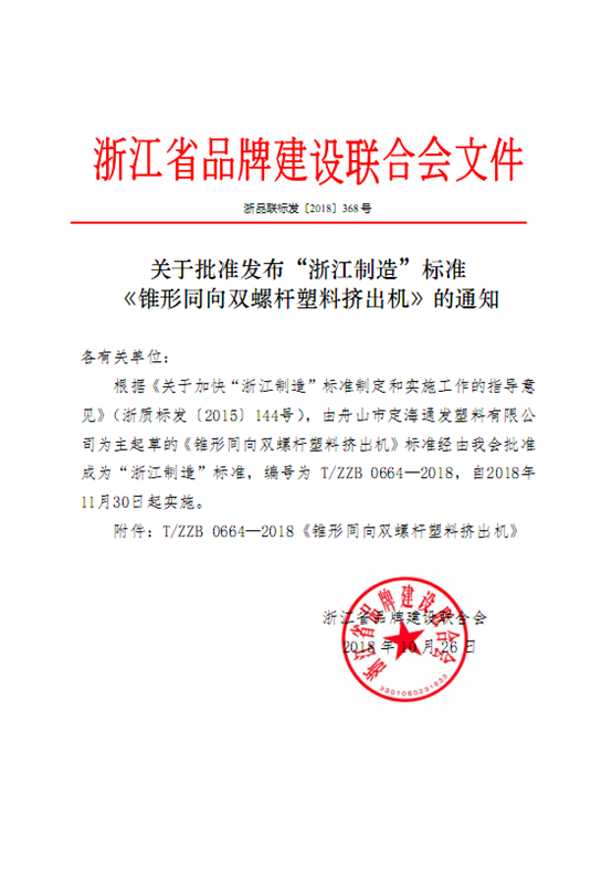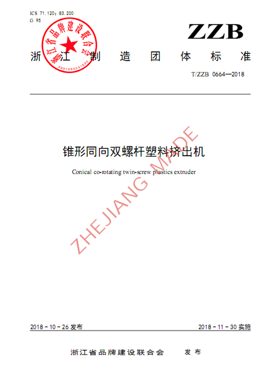 近日,由我公司為主起草的《錐形同向雙螺桿塑料擠出機》“浙江制造”標準由浙江省品牌建設聯合會批準發布實施,標準編號T/ZZB 0664-2018,該標準自2018年11月30日起實施。